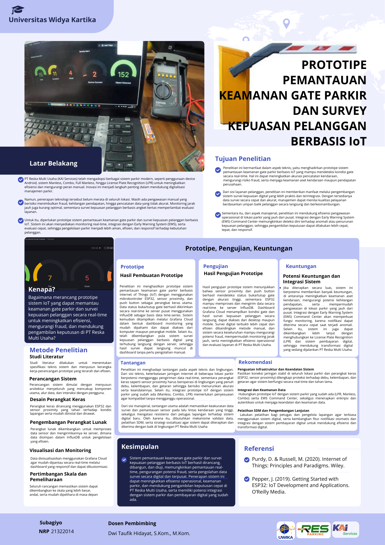 Transformasi digital dalam sistem parkir menjadi kunci untuk meningkatkan efisiensi operasional, integritas petugas, dan kepuasan pelanggan. PT Reska Multi Usaha (KAI Services) telah menerapkan sistem parkir berbasis teknologi seperti Manless, Full Manless, Combo, dan LPR. Namun, masih terdapat lokasi dengan pengawasan manual yang rentan terhadap kecurangan dan data kendaraan menginap yang tidak akurat. Penelitian ini mengembangkan prototipe sistem berbasis Internet of Things (IoT) yang memantau status gate parkir dan mengelola survei pelanggan secara otomatis, dengan data yang dikirim secara real-time ke dashboard pusat. Sistem ini menggunakan sensor posisi gate, mikrokontroler, dan